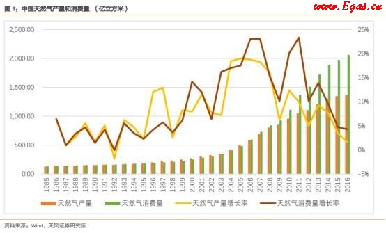2016年中國天然氣消費量2058億立方米,產(chǎn)量1368億立方米,供需缺口近700億立方米,對外依存度34%。自2014年起,中國天然氣的產(chǎn)量和消費量增速均有所放緩,但消費量的增速仍然持續(xù)大于產(chǎn)量的增速。隨著中國城鎮(zhèn)化過程中居民能源消費結構的變化,以及環(huán)保監(jiān)管日趨嚴格的背景下燃氣替代煤炭供電供熱需求的提升,天然氣下游消費有進一步增長的空間。開發(fā)國內非常規(guī)天然氣、進口管道氣、進口LNG是解決中國天然氣供需缺口的三大主要途徑。
