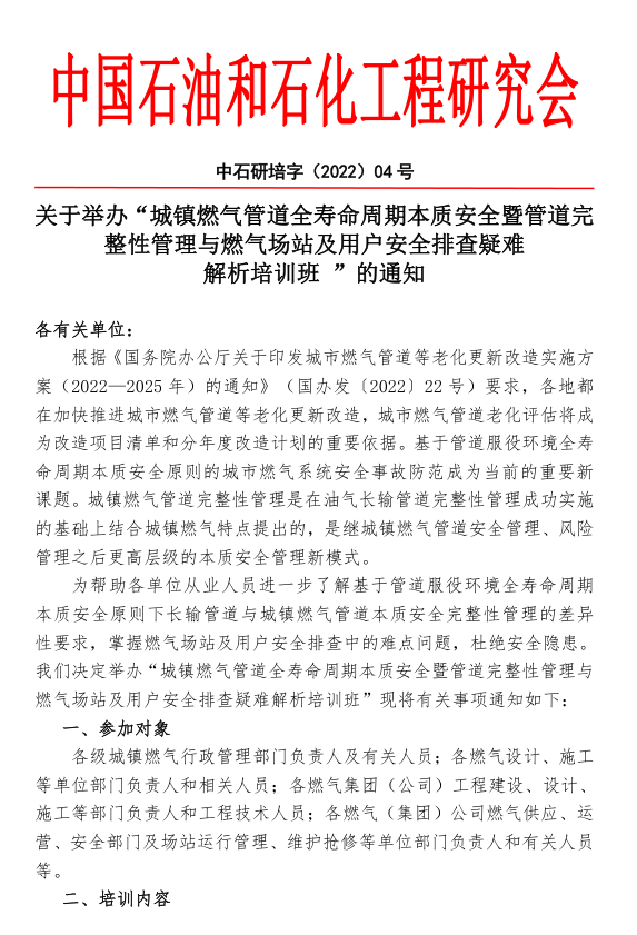 為幫助各單位從業(yè)人員進一步了解基于管道服役環(huán)境全壽命周期本質(zhì)安全原則下長輸管道與城鎮(zhèn)燃?xì)夤艿辣举|(zhì)安全完整性管理的差異性要求,掌握燃?xì)鈭稣炯坝脩舭踩挪橹械碾y點問題,杜絕安全隱患。我們決定舉辦“城鎮(zhèn)燃?xì)夤艿廊珘勖芷诒举|(zhì)安全暨管道完整性管理與燃?xì)鈭稣炯坝脩舭踩挪橐呻y解析培訓(xùn)班”現(xiàn)將有關(guān)事項通知如下: