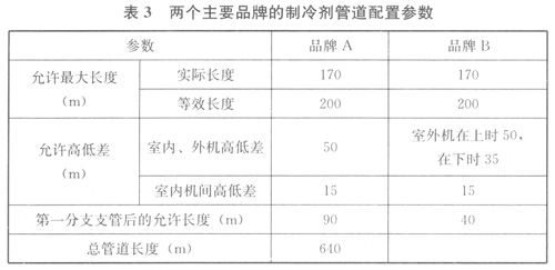 室內(nèi)、外機(jī)之間以及室內(nèi)機(jī)之間的最大管長(zhǎng)最大高差,是燃?xì)鉄岜每照{(diào)系統(tǒng)的重要性能參數(shù),為保證系統(tǒng)運(yùn)行安全、穩(wěn)定、高效,在設(shè)計(jì)時(shí)系統(tǒng)的最大管長(zhǎng)與最大高差不應(yīng)超過(guò)所選用產(chǎn)品的技術(shù)要求。表3列出了兩個(gè)主要品牌的相關(guān)技術(shù)要求。