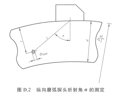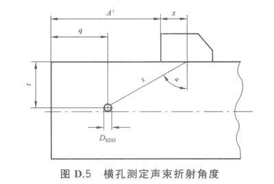 探頭折射角可通過滿足要求的橫孔最大回波來測定,也可在工件、參考試塊或者是在比例圖紙上直接測定,如圖D.2所示。