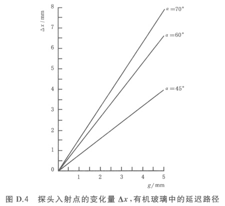 有機(jī)玻璃斜楔(cd=2730m/s),非合金鋼被檢件(ct=3255m/s),探頭入射點(diǎn)位置的變化量(Dx),三個最常用的聲束角度和修正深度(g)可從圖D.4中讀出。