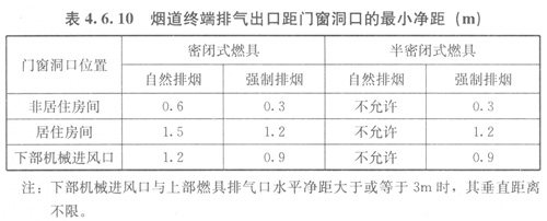 4.6.10穿外墻的煙道終端排氣出口距門窗洞口的最小凈距應符合表4.6.10的規(guī)定。距地面的垂直凈距不得小于0.3m。煙道終端排氣出口應設置在煙氣容易擴散的部位。