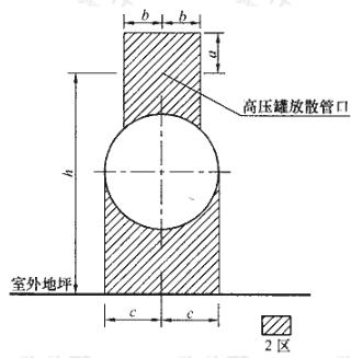 以儲罐安全放散閥放散管管口為中心,當管口高度h距地坪大于4.5m時,半徑b為3m,頂部距管口a為5m(當管口高度h距地坪小于等于4.5m時,半徑b為5m,頂部距管口a為7.5m)以及管口到地坪以上的范圍為2區(qū)。