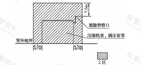 建筑物內部及建筑物外壁4.5m內,屋頂(以放散管管口計)以上7.5m內的范圍為2區(qū)。