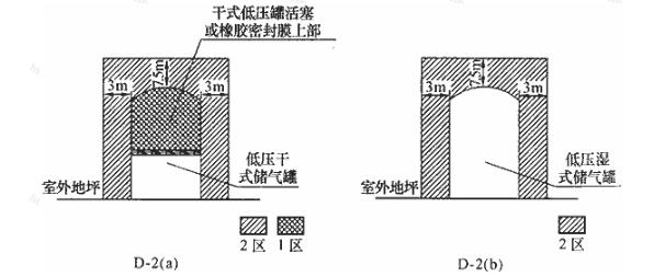 圖D-3 低壓儲氣罐進出氣管閥門間的爆炸危險區(qū)域等級和范圍的劃分