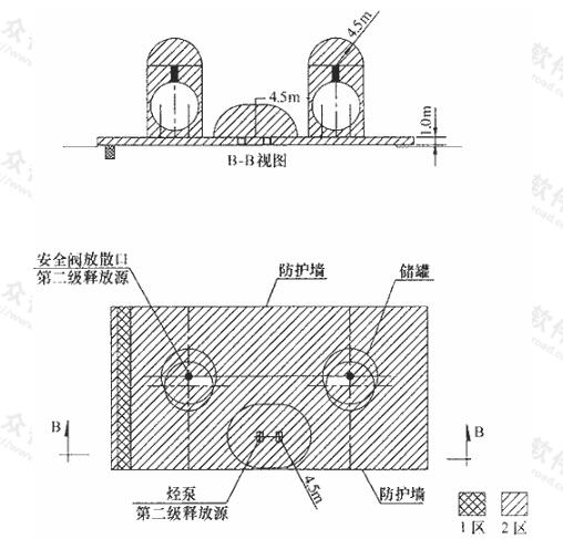 1 以儲(chǔ)罐安全閥放散管管口為中心,半徑為4.5m,以及至地面以上的范圍內(nèi)和儲(chǔ)罐區(qū)防護(hù)墻以內(nèi),防護(hù)墻頂部以下的空間劃為2區(qū);