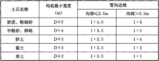 注:1 當(dāng)遇流砂時(shí),溝底寬度和邊坡數(shù)據(jù)應(yīng)根據(jù)施工方案另行確定;