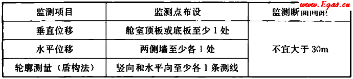 4.4.9 綜合管廊結(jié)構(gòu)變形監(jiān)測時間和周期應(yīng)根據(jù)埋深、結(jié)構(gòu)形式、施工方法、變形特征、變形速率、觀測精度和工程地質(zhì)條件等因素綜合確定;監(jiān)測期間,可根據(jù)變形量的變化情況適當調(diào)整。在綜合管廊運營初期,第1年宜每季度監(jiān)測1次,第2年宜每半年監(jiān)測1次,當發(fā)現(xiàn)變形顯著或變形速率明顯增大時,應(yīng)增加觀測次數(shù)或持續(xù)觀測。