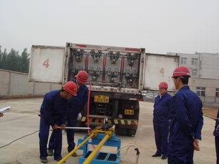 (圖三)運(yùn)輸壓縮天然氣的槽車到站區(qū)就位。卸車前關(guān)閉CNG站內(nèi)及卸車柱上所有閥門,操作人員必須使用防爆工具。