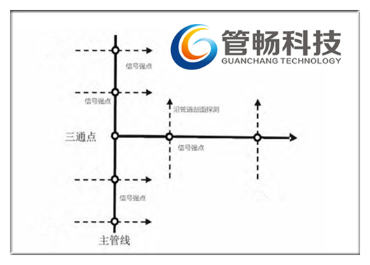 探測三通點時,也可采用間接的幾何交匯法;當我們發(fā)現(xiàn)疑似三通位置時(通常在遇到三通時,三通位置信號會異常強烈),在與主管線垂直方向3米以外橫切探測,找出信號最強的一個點后,在其延伸方向再找出第二個信號最強點,兩點連成一條直線,用交匯法就可以定出三通點的位置。