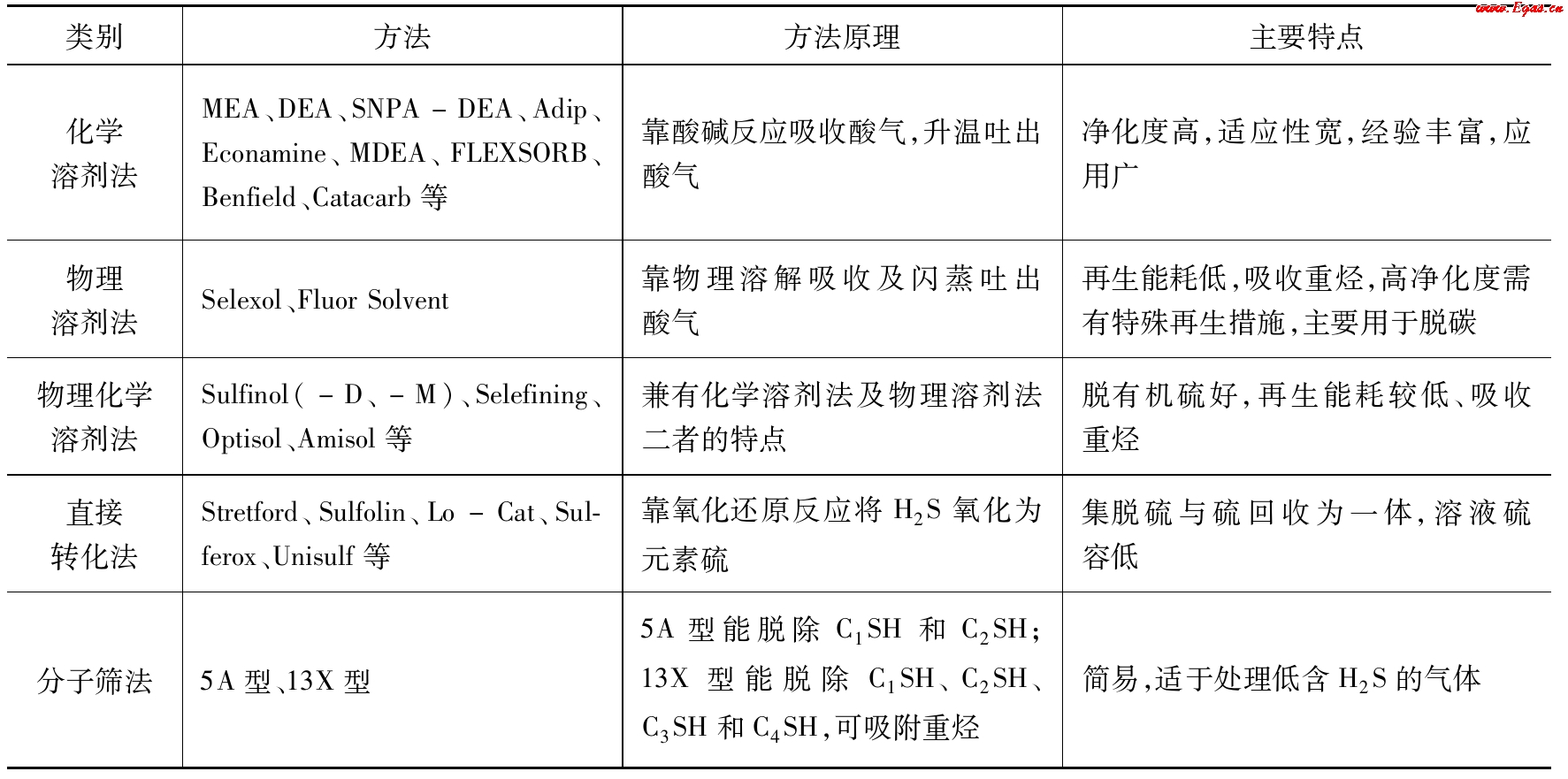 用于天然氣液化過程中脫除酸性組分的方法有化學(xué)溶劑法、物理溶劑法、物理化學(xué)溶劑法、直接轉(zhuǎn)化法、分子篩法等。表2-2給出了有代表性的方法及其脫硫原理與主要特點。