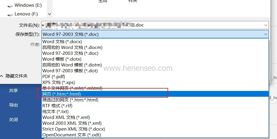 3、在另存為對話框中選擇文件類型為html網(wǎng)頁文件。