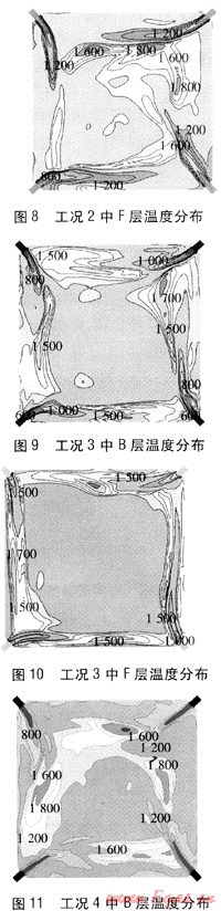 ⑤ 工況5中所有噴口全開,這時(shí)燃燒器的高寬比達(dá)到16.55。計(jì)算結(jié)果顯示,實(shí)際切圓直徑過大,氣流從燃燒器噴出后直接沖刷爐壁,由圖13、14可知,燃燒器平面的高溫區(qū)域均在壁面附近,這樣會(huì)在爐壁附近形成還原性氣氛,降低了灰熔點(diǎn),運(yùn)行中容易造成爐壁的結(jié)渣。