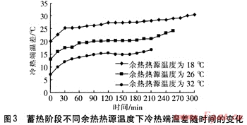 由實(shí)驗(yàn)結(jié)果可知:余熱熱源溫度為18℃時(shí),冷熱端溫差為20.20~30.95℃,制熱性能系數(shù)為1.52~1.14;余熱熱源溫度為26℃時(shí),冷熱端溫差為12.55~23.20℃,制熱性能系數(shù)為1.86~1.51;余熱熱源溫度為32℃時(shí),冷熱端溫差為6.50~17.3℃,制熱性能系數(shù)為2.23~1.71??梢钥闯?,余熱熱源溫度越高,冷熱端溫差越小,制熱性能系數(shù)越大。