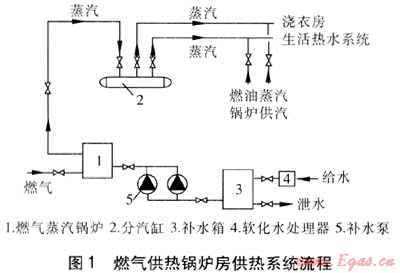 該酒店裙樓地下共有3層,其中地下一層的原發(fā)電機(jī)組儲油庫現(xiàn)已停止使用,建筑面積約60m2,緊鄰地下一層出口坡道,距燃?xì)膺M(jìn)戶管道8m,經(jīng)改造后,可作為燃?xì)夤徨仩t房。燃?xì)夤徨仩t房供熱系統(tǒng)流程見圖1。