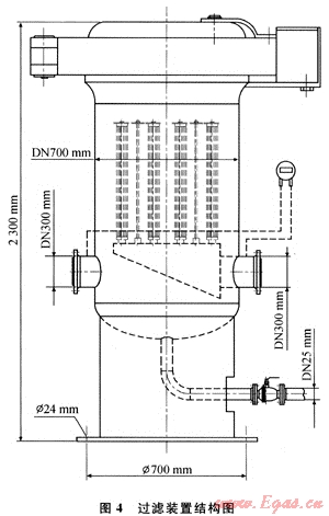 4) 改進過濾裝置,采用HFB/150天然氣高效沉降過濾器,該裝置過濾器由沉降段及過濾段兩部分組成,沉降段由分隔板構成一個重力沉降室;過濾段安裝有若干只濾芯。當含塵氣體進入分離器時,在重力作用下先將粗顆粒雜質分離,從而減輕了后續(xù)精密濾芯的負荷,較細的雜質則隨著氣體由過濾段的濾芯除去,最終氣體得以凈化。改進后的過濾器裝置結構圖見圖4。