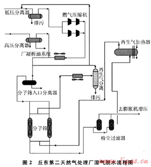 低壓原料氣進裝置區(qū)后首先進行增壓,與中壓天然氣匯合后在3.0MPa、25℃條件下進入分離器除去游離水和機械雜質,再進入分子篩干燥器,脫水后干氣露點小于-80℃,干氣進入旋風分離器除去分子篩粉末,然后進入輸氣管線。流程如圖2所示。