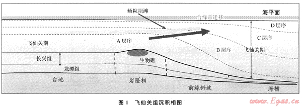 通過(guò)對(duì)海槽兩側(cè)大量的地震資料做地震層序分析,鮞灘儲(chǔ)層主要位于臺(tái)地邊緣及臺(tái)地上相對(duì)高地勢(shì)區(qū)域,具有呈片、分布范圍廣的特征,在海槽西部區(qū)東北緣和東南緣一帶,明顯見(jiàn)到有利于儲(chǔ)層發(fā)育的高能臺(tái)緣帶朝海槽快速遷移的古地貌證據(jù)。