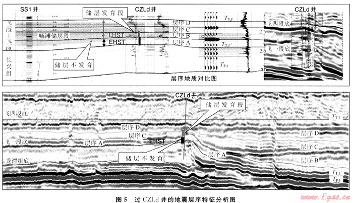 應(yīng)用地震層序分析技術(shù)尋找高能鮞灘儲(chǔ)層發(fā)育的地震層序,從而尋找鮞灘儲(chǔ)層發(fā)育的時(shí)間與空間。利用上述方法預(yù)測(cè)的CZLd井鉆遇飛仙關(guān)組鮞灘儲(chǔ)層厚47m,獲得工業(yè)氣流,同時(shí)鉆遇長(zhǎng)興組生物礁儲(chǔ)層并獲得工業(yè)氣流。如圖5為過(guò)該井的測(cè)井資料與地震資料相結(jié)合的地震層序劃分,合成記錄中黃色部分為測(cè)井解釋儲(chǔ)層。