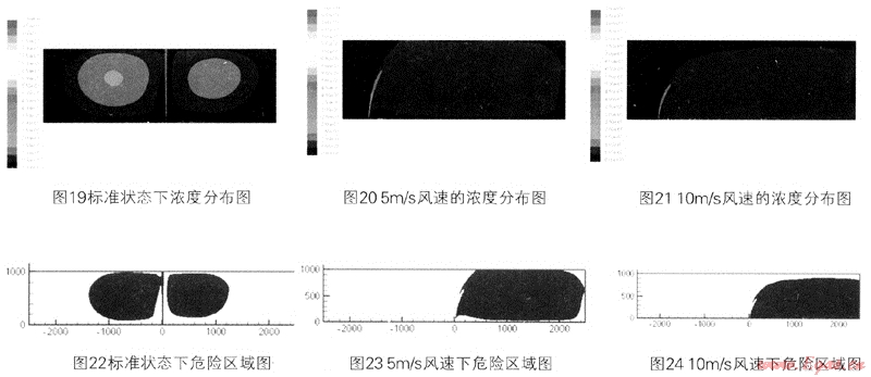 由圖19、20、21可以看出,隨著風速的從無到有,從小變大,濃度擴散區(qū)域也向右明顯偏轉(zhuǎn),并且擴散區(qū)域變大,當風速為10m/s時,擴散區(qū)域已經(jīng)超過了界定的區(qū)域。并且危險區(qū)域也隨風速變大而擴大,波及到下風向的近地面。
