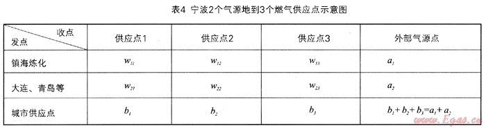 假設(shè)有m個外來氣源點(diǎn),n個該城區(qū)燃?xì)夤?yīng)(銷售)點(diǎn)。則令以a1,a2,…am表示各外來氣源點(diǎn)運(yùn)至該市的輸出量,b1,b2,…,bn表示各供應(yīng)(銷售)點(diǎn)的燃?xì)馊菁{量(銷售量),有∑ai=∑bj。xij表示氣源地i運(yùn)往供應(yīng)點(diǎn)j的運(yùn)氣量,wij表示相應(yīng)的單位運(yùn)氣量的運(yùn)輸時間(單位運(yùn)氣量的運(yùn)輸時間因運(yùn)輸方式的不同而改變),如表2所示