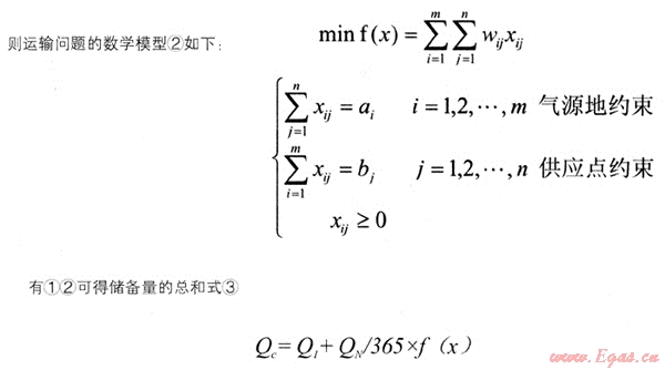 其次,確定上游氣源到目的地的最小運(yùn)輸耗時。由于長輸管道因某種外部因素(地震,泥石流等)破壞導(dǎo)致無法輸配燃?xì)?,必須依靠其他途徑運(yùn)輸至城市內(nèi)部(水運(yùn),陸運(yùn)等)??梢酝ㄟ^建立線性規(guī)劃方程算出在滿足供氣量等于用氣量的情況下,從各氣源地運(yùn)輸至城市供應(yīng)點(diǎn)的最少必要時間。