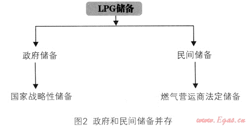 目前世界上的LPG儲備主要有兩種儲備模式:如美國,有多家資本雄厚的大型燃?xì)饽茉唇?jīng)營企業(yè),這些企業(yè)自發(fā)建立大量儲備;如日本、韓國,由政府和民間共同承擔(dān)LPG儲備。國家建立公共儲備的同時,強(qiáng)制企業(yè)建立一定的商業(yè)儲備。如圖2所示