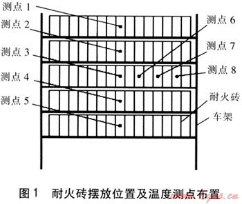 燃氣輻射干燥窯的底部鋪設(shè)2道鋼軌,將耐火磚放置于小車架被推入窯中,在加熱過程中,耐火磚原地不動,吸收紅外輻射能量而升溫。耐火磚的擺放位置及溫度測點布置見圖1。