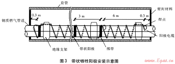 考慮到帶外防腐層的鋼質套管的屏蔽作用,可以在套管內設置局部陰極保護以解決套管屏蔽的問題[7]。套管內的鋼質燃氣管道可采用帶狀犧牲陽極。帶狀犧牲陽極具有一定的柔性,可以緊緊纏繞在管道之外,位于套管之內,陽極電纜可以直接焊接在燃氣管道的外壁上,帶狀犧牲陽極示意圖見圖3。