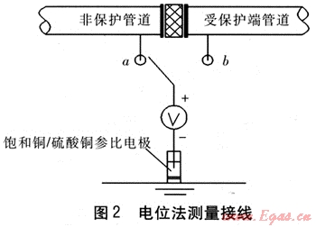 在絕緣接頭性能良好的情況下,點b處電位Vb在數(shù)值上和管道陰極保護電位相近(-850~-1200mV),點a處電位Va在數(shù)值上與管道自然電位相近。根據(jù)測量結果,若Vb明顯地比Va更小(電位差的絕對值為200~500mV),則認為絕緣接頭的絕緣性能良好。如果電位差的絕對值小于200mV,則應該使用其他檢測方法進一步測量怕-,以確定絕緣接頭是否失效。