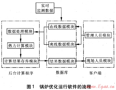 鍋爐優(yōu)化運(yùn)行軟件的核心功能在于利用監(jiān)測(cè)數(shù)據(jù)通過對(duì)鍋爐運(yùn)行可調(diào)參數(shù)的控制使鍋爐實(shí)現(xiàn)安全經(jīng)濟(jì)運(yùn)行。鍋爐優(yōu)化運(yùn)行軟件基于B/S模式(瀏覽器/服務(wù)器模式,即用戶工作界面通過IE瀏覽器來(lái)實(shí)現(xiàn))的Web網(wǎng)絡(luò)數(shù)據(jù)庫(kù)應(yīng)用系統(tǒng),可以在線顯示鍋爐受熱面的壁溫?cái)?shù)據(jù)、污染物數(shù)據(jù)等,可指導(dǎo)現(xiàn)場(chǎng)人員操作。數(shù)據(jù)庫(kù)采用SQL Server2000,后臺(tái)計(jì)算程序采用Visual C++語(yǔ)言編寫,結(jié)合在線監(jiān)測(cè)數(shù)據(jù)進(jìn)行鍋爐運(yùn)行調(diào)節(jié)[3]。鍋爐優(yōu)化運(yùn)行軟件的流程見圖1。