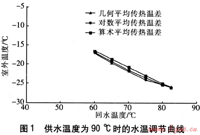 量調(diào)節(jié)的基本思路是供水溫度保持不變,熱水流量隨建筑負(fù)荷變化而變化。當(dāng)供水溫度為90℃時(shí),由式(7)可計(jì)算得到不同室外溫度下的回水溫度及相對(duì)流量比,由此可得到特定供水溫度下采用不同形式平均傳熱溫差的水溫、流量調(diào)節(jié)曲線(見圖1、2)。