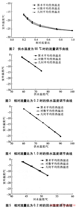 由圖1、2可知,分別采用這3種形式的平均傳熱溫差時(shí),不同供水溫度條件下對(duì)應(yīng)的水溫、流量調(diào)節(jié)曲線很接近。這主要是由于分別采用這3種形式平均傳熱溫差的散熱器熱流量計(jì)算式的擬合效果基本相同。