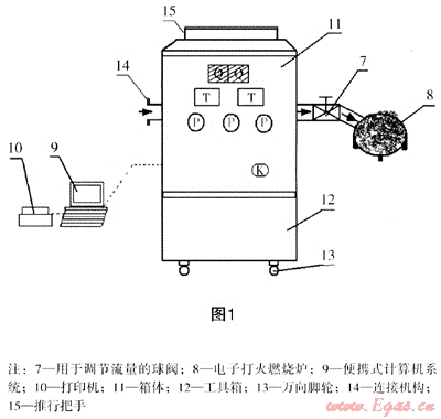 B. 箱體外觀:為在線實(shí)流檢測的方便性,將裝置設(shè)計為可移動式箱體,箱體下部設(shè)有工具箱,以提高其便攜性。為了方便其移動,裝置箱體頂部設(shè)計有推行把手,箱體底部設(shè)有萬向腳輪,箱體內(nèi)設(shè)有與檢定管路相連接的一臺或相并聯(lián)的一臺以上的標(biāo)準(zhǔn)表,標(biāo)準(zhǔn)表選用高準(zhǔn)確度氣體腰輪流量計,檢定管路的進(jìn)氣端設(shè)有可與被檢表連接的連接機(jī)構(gòu),標(biāo)準(zhǔn)表前后及被檢表后均設(shè)有一段直管段,在每一臺標(biāo)準(zhǔn)表前的管路上均設(shè)有流量調(diào)節(jié)閥,為了提高測量準(zhǔn)確度,在標(biāo)準(zhǔn)表前設(shè)有凈化燃?xì)獾倪^濾器。在每一臺標(biāo)準(zhǔn)表前后的管路上設(shè)置有與便攜式計算機(jī)系統(tǒng)連接的壓力傳感器和溫度傳感器,在檢定管路的末端設(shè)有與其連接的燃燒爐,以保證防止大氣污染。