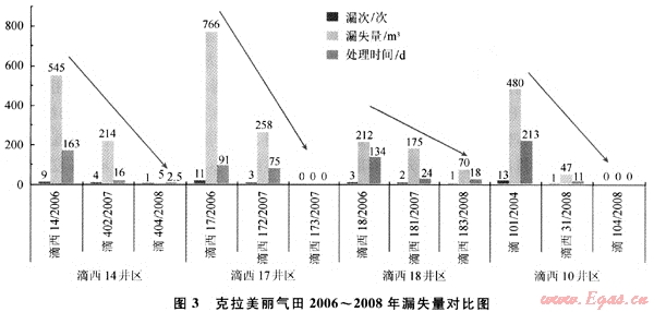 通過防漏、堵漏技術(shù)的應(yīng)用及方案的有效實施,防漏、堵漏工作取得了明顯效果(圖3),2007~2008年上鉆的滴西20、滴西21、滴西22、滴西171、滴西172、滴西173、滴西181、滴西182、滴西183、滴402、滴404、滴103、滴104、滴西25、滴西31井等井發(fā)生井漏的次數(shù)、漏失量及處理井漏耗費時間均大幅度減少。