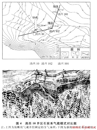 2) 滴西10井區(qū)。滴西10井鉆于2003年,石炭系巖性為流紋巖,2004年在石炭系試氣2層均獲得高產(chǎn)工業(yè)氣流。按照頂面構(gòu)造控藏模式,2004、2005年分別鉆探滴101井和滴102井2口評價井,石炭系巖性均為凝灰?guī)r,無油氣顯示。2005年底,按斷鼻構(gòu)造氣藏圈定滴西10井井控面積4.74km2(圖4中的上圖),探明天然氣地質(zhì)儲量20.20×108m3。2006年,對滴西10井區(qū)按巖性圈閉模式進行了重新解釋,提出了新的氣藏模式(圖4中的下圖),并對滴102井進行了加深鉆探以驗證新模式。滴102井于3310m開始加深,3460m完鉆,至3340~3370m井段鉆遇流紋巖與滴西10井出氣段巖性一致。鉆探結(jié)果證實了新模式的正確性,指導(dǎo)了后續(xù)探井的部署。2008年,按照巖性巖相控藏模式,鉆探了滴103井和滴104井,均獲得成功,新增含氣面積13.57km2,新增探明天然氣地質(zhì)儲量83.07×108m3。