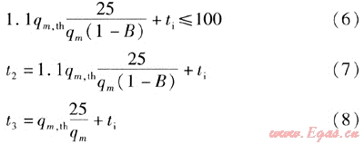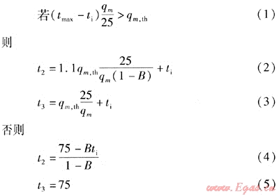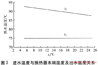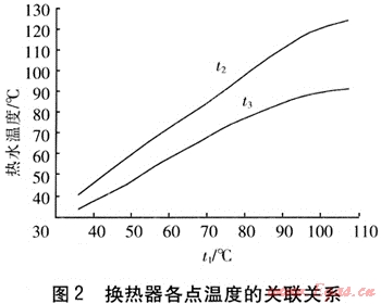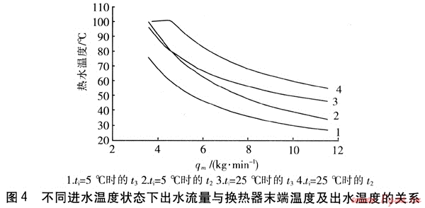 依據(jù)上述的計(jì)算公式對(duì)各狀態(tài)(如出水流量變化)分析可得出正常使用的溫度范圍為t2<92.5℃,t3<75℃。再依據(jù)圖2可推算出t1<75.5℃。