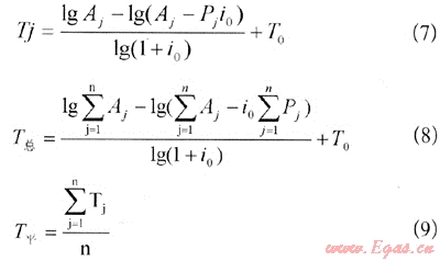 分別將j個加氣站投資回報期(Tj)、所有加氣站總投資回報期(T總)、及加氣站平均投資回報期(T平)代入上式,得到以下各公式: