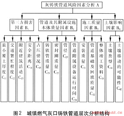 例如,我們把城鎮(zhèn)燃氣灰鑄鐵管道風險評價層次化,一共分成4個一級因素,設(shè)定風險權(quán)重和為400%,然后將4個一級因素繼續(xù)層次化,每個一級因素經(jīng)層次分析并加權(quán)平均計算后得出埋地灰鑄鐵天然氣管道各風險因素的權(quán)重。圖2是城鎮(zhèn)燃氣灰鑄鐵管道層次分析結(jié)構(gòu)。