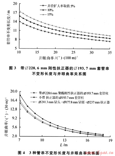 由于實(shí)測井徑不準(zhǔn)確,按井徑擴(kuò)大率5%、10%和15%對帶Ø228.6mm剛性扶正器的Ø193.7mm套管柱反算允許通過的套管串不變形長度(見圖3),按井徑擴(kuò)大率10%對3種不同管串剛度進(jìn)行模擬,即計(jì)算不變形長度與井眼曲率關(guān)系(見圖4)。