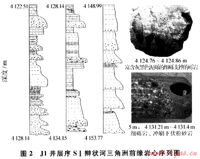 辮狀河三角洲前緣亞相在3個(gè)層序中均有分布,巖礦特征表明巖石成分成熟度和結(jié)構(gòu)成熟度較低,穩(wěn)定礦物石英含量約35%,巖屑含量較高,約50%。顆粒呈棱角-半圓狀,分選中等-差,主要由淺灰色、灰色礫巖、含礫砂巖、粉-細(xì)砂巖和灰色、深灰色泥巖組成,砂巖中普遍含黃鐵礦(1.96%)。