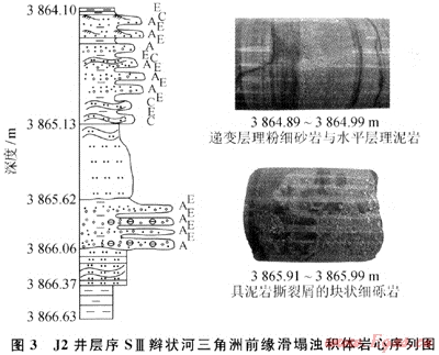 濁積體為辮狀河三角洲前緣沉積物發(fā)生滑動(dòng)或滑塌而成的砂巖堆積體,往往位于三角洲前緣的主推進(jìn)方向前方的古地形低洼處,通常規(guī)模較小,呈小型透鏡體狀,厚度也較薄,本區(qū)濁積體巖性細(xì),以粉-細(xì)砂巖為主,發(fā)育段成砂泥巖薄互層,砂巖中見(jiàn)變形構(gòu)造,并有沖刷面、遞變層理、波紋層理、塊狀層理等,近底部含泥礫或礫石,具有典型的鮑瑪序列,鮑瑪序列一般發(fā)育不完整,A、C、E段較為多見(jiàn)(圖3)。地震剖面上;響應(yīng)于丘形或透鏡狀反射特征。