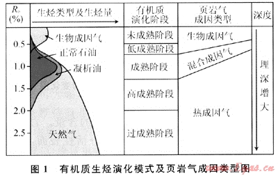 與常規(guī)油氣藏的成藏條件不同,頁巖氣來源由生物成因氣和熱成因氣組成,吸附氣和游離氣并存,具有自生自儲(或短距離運移)的特征。因此頁巖氣聚集受埋藏深度、有機質(zhì)的成熟度及輸導、封蓋條件制約較小。埋藏較淺、有機質(zhì)成熟度低的區(qū)段發(fā)育生物成因的頁巖氣;埋藏深、有機質(zhì)成熟度高的區(qū)段發(fā)育熱成因的頁巖氣;埋藏深度和有機質(zhì)成熟度中等偏低的區(qū)段發(fā)育混合成因的頁巖氣(圖1)。美國第一口頁巖氣發(fā)現(xiàn)井深度最淺,還不足10m,而Haynesville頁巖氣聚集最大深度則近4000m;Antrim頁巖氣的有機質(zhì)成熟度(Ro)僅為0.4%~0.6%,Lewis頁巖氣的Ro則為1.6%~1.9%,頁巖氣聚集的Ro最大可達3%[24~33]。