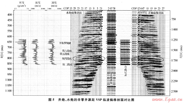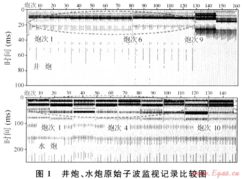 一般情況下,使用多級(jí)檢波器采集VSP數(shù)據(jù)時(shí),“井炮”激發(fā)的能量比“水炮”強(qiáng)、一致性比“水炮”好,主頻比“水炮”高、抗低頻的能力較“水炮”強(qiáng),變“水炮”為“井炮”是提高原始資料品質(zhì)的一種有效途徑。