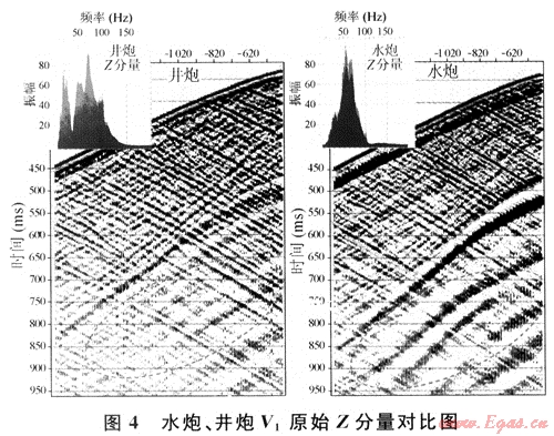 圖3為井炮、水炮激發(fā)的零井源距原始Z分量比較圖,從圖中可以看到以下特征:①兩個(gè)Z分量記錄初至都起跳干脆,時(shí)序規(guī)則,符合正常變化規(guī)律;②兩個(gè)Z分量波組特征明顯,波場(chǎng)信息豐富,清晰可見多套上行波和下行波;③記錄上都出現(xiàn)了井筒波、高頻干擾等;④從粉紅色箭頭內(nèi)的上行縱波可以看出,在水炮記錄上表現(xiàn)為上行縱波能量隨著偏移距的增大而逐漸減弱,到最后完全淹沒在噪聲中,而在井炮記錄上表現(xiàn)為能量隨著偏移距的增大基本不變,這說明井炮能量的穩(wěn)定性比水炮的好;⑤淺綠色橢圓內(nèi)的波組能量在水炮記錄剖面上表現(xiàn)為隨著深度的加深而逐漸減弱,到最后完全淹沒在噪聲中,而在井炮記錄剖面上表現(xiàn)為隨著深度的加深也有減弱的趨勢(shì),但比水炮減弱的速度慢得多,在1000ms處還能清楚地看到上行縱波的能量;⑥水炮Z分量原始資料的主頻在48Hz左右,優(yōu)勢(shì)頻帶為30~80Hz,井炮Z分量原始資料的主頻在51Hz左右,優(yōu)勢(shì)頻帶為30~100Hz。由于此井水炮震點(diǎn)處的淺層堆積物少,1m以下就為致密砂巖,因此二者的主頻都較高,完全超過了地面地震資料的主頻;⑦井炮激發(fā)抗井筒波的能力比水炮激發(fā)強(qiáng)。