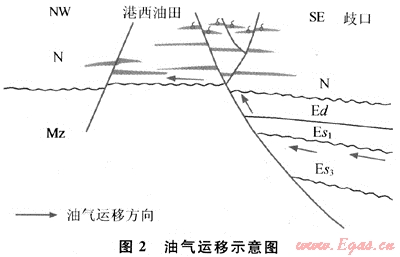 港西地區(qū)斷層發(fā)育,新近系和古近系又是不整合接觸,這為港西凸起的淺層氣從深層往上運(yùn)移創(chuàng)造了很好的條件(圖2),而且當(dāng)斷層切過深部油藏時(shí),地層壓力驟然下降,天然氣會(huì)不斷地從石油中析出,沿著斷層向上運(yùn)移,形成純氣藏或氣頂。