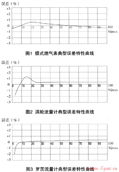 為確保燃?xì)庥?jì)量的精確性和公平性,應(yīng)根據(jù)燃?xì)夤镜囊蠹坝脷鈫挝皇褂玫木唧w隋況,確定流量計(jì)的精度。燃?xì)饬髁坑?jì)的計(jì)量精度一般為1.0級(jí)和1.5級(jí)。常用流量計(jì)的典型誤差特性曲線如圖1、圖2、圖3。