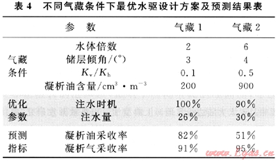 通過(guò)上述對(duì)凝析氣藏不同的注水方案結(jié)果進(jìn)行的統(tǒng)計(jì)分析,明確了不同參數(shù)和因素對(duì)于凝析氣藏注水開(kāi)發(fā)效果的影響。之后可以得出不同條件下的凝析氣藏注水開(kāi)發(fā)的最優(yōu)方案,并對(duì)其凝析油氣的采收率進(jìn)行預(yù)測(cè)。筆者以兩種不同條件下的凝析氣藏為例,給出了最優(yōu)注水開(kāi)發(fā)方案的設(shè)計(jì)參數(shù)及預(yù)測(cè)指標(biāo)(表4)。