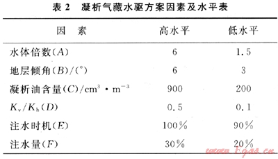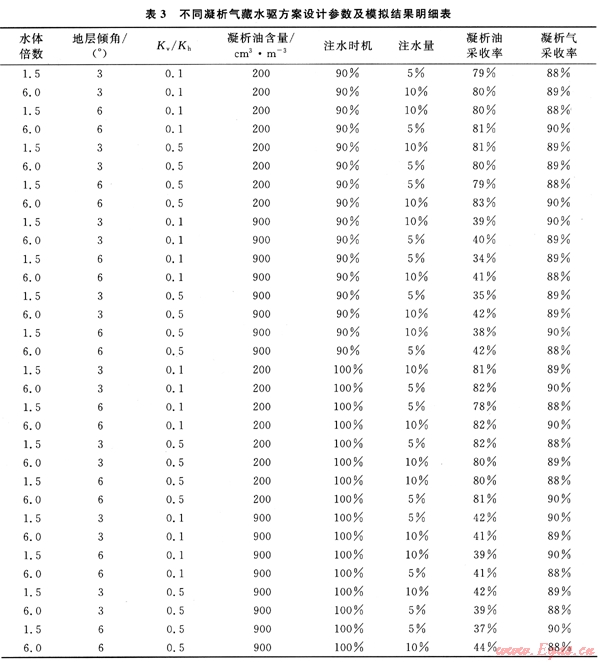 1) 借助實(shí)驗(yàn)設(shè)計(jì)方法綜合考慮底水規(guī)模、儲(chǔ)層傾角、垂向滲透率、凝析油含量等地質(zhì)、油藏因素和注水時(shí)機(jī)、注水量等工程因素,對(duì)凝析氣藏注水開(kāi)發(fā)進(jìn)行了科學(xué)、高效的分析設(shè)計(jì),確定了可以滿足設(shè)計(jì)需要的少量的、典型的、代表性的水驅(qū)方案。大大提高了開(kāi)發(fā)方案設(shè)計(jì)的效率,減少了設(shè)計(jì)工作的工作量。