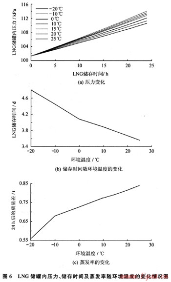 由圖6可知,環(huán)境溫度越高,LNG儲罐內(nèi)壓力上升得越快,在一定的LNG儲罐承壓范圍內(nèi),LNG的儲存時間越短,蒸發(fā)率也就越大。